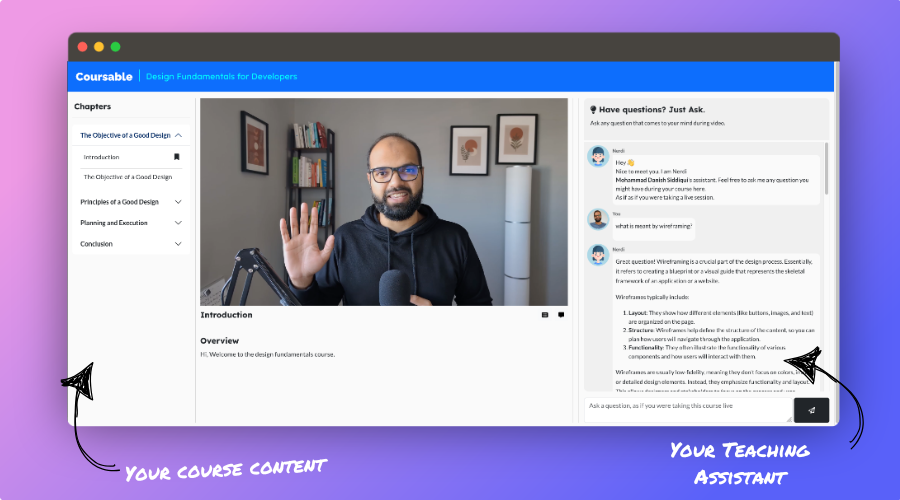 Our platform empowers your students to engage with your course as if they were taking it live, using AI as your personal teaching assistant.